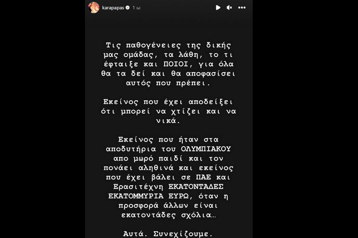 Ο Ολυμπιακός ηττήθηκε 3-1 από την ΑΕΚ στο Γεώργιος Καραϊσκάκης για την 5η αγωνιστική των playoffs της Stoiximan Super League. Ο εκ των αντιπροέδρων και Γενικός Διευθυντής των ερυθρόλευκων, Κώστας Καραπαπάς, με story του στο Instagram μετά το τέλος του αγώνα τόνισε πως τα λάθη της ομάδας του θα τα δει εκείνος που πρέπει και θα αποφασίσει, αναφερόμενος στον Βαγγέλη Μαρινάκη.