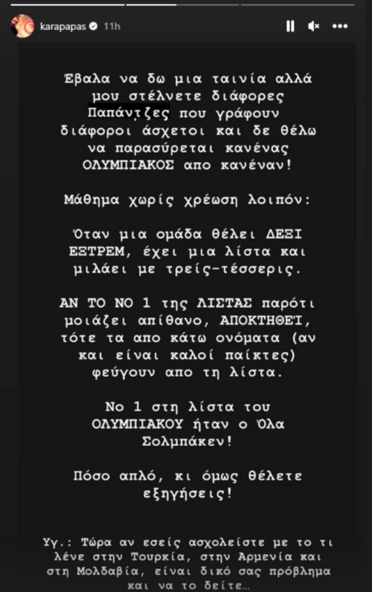“Έβαλα να δω μια ταινία αλλά μου στέλνετε διάφορες παπάντζες που γράφουν διάφοροι άσχετοι και δεν θέλω να παρασύρεται κανέναν ΟΛΥΜΠΙΑΚΟΣ από κανέναν!