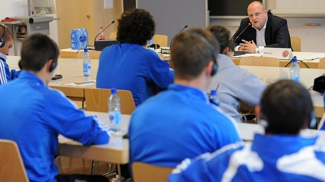 * Στη φωτογραφία o Καρλ Ντοντ μιλάει στους Έλληνες διεθνείς της εθνικής Νέων για τον κίνδυνο που αντιμετωπίζουν οι ποδοσφαιριστές σε απόπειρες δωροδοκίας.