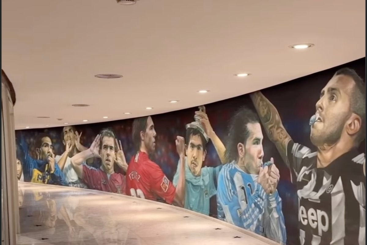 Ωστόσο, ένα από τα πιο εντυπωσιακά σημεία της έπαυλης είναι ένας διάδρομος που λειτουργεί σαν “τούνελ αναμνηστικών”. Εκεί υπάρχουν πίνακες και φωτογραφίες από τις σημαντικότερες στιγμές της καριέρας του Τέβες, από τα πρώτα του βήματα στην Μπόκα Τζούνιορς μέχρι τη θητεία του σε συλλόγους όπως η Γιουβέντους και η Γουέστ Χαμ.