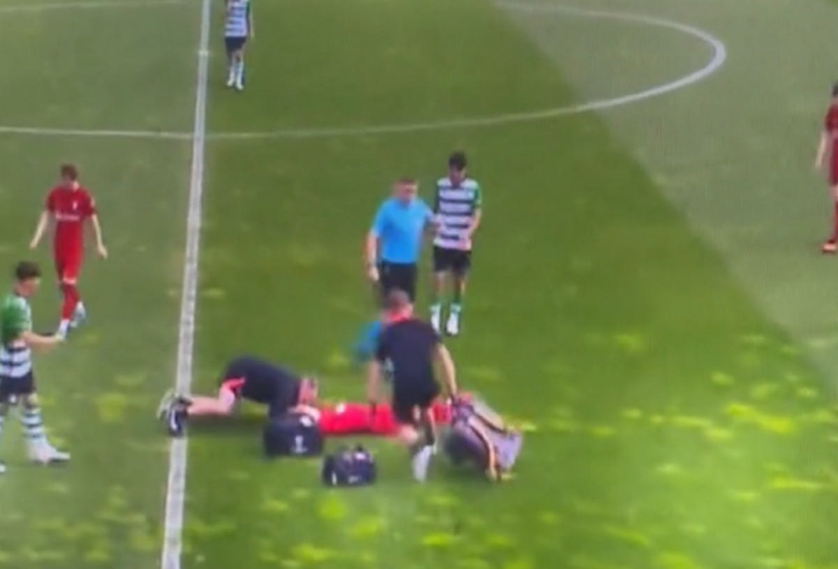 Σε αυτό ήταν πρωταγωνιστής ο Μπεν Ντόουκ, με τον εξτρέμ της Λίβερπουλ να χτυπάει στο κεφάλι σε σύγκρουση που είχε στον αέρα με έναν παίκτη της Σπόρτινγκ, για να κάνει κατόπιν μερικά βήματα πριν καταρρεύσει στον αγωνιστικό χώρο.