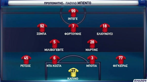 Ο Πάουλο Μπέντο παρέταξε τον Ολυμπιακό με αναμενόμενη διάταξη και πρόσωπα. Το γνωστό 4-2-3-1, με τον Ομάρ να μένει στον πάγκο και τους Φιγκέιρας-Ρέτσο να παίζουν στα άκρα της άμυνας.Αξιοσημείωτο πως Μάριν και Τσόρι Ντομίνγκες έμειναν εκτός αποστολής.