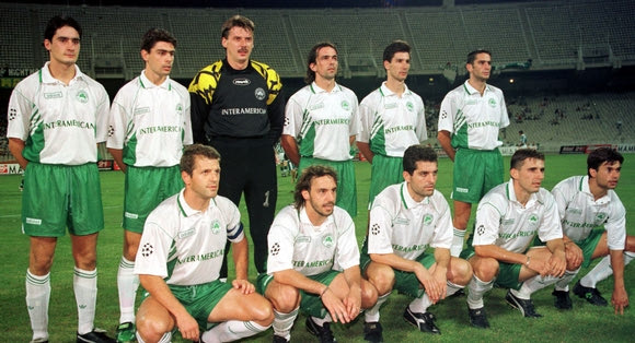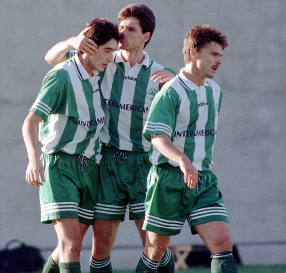 15/9/1996: Απόλλων Σμύρνης-Παναθηναϊκός 0-2. Ο Νίκος Λυμπερόπουλος μόλις έχει πετύχει το πρώτο του γκολ στο πρωτάθλημα με τη φανέλα του τριφυλλιού και ο Μαρίνος Ουζουνίδης τρέχει να τον συγχαρεί.