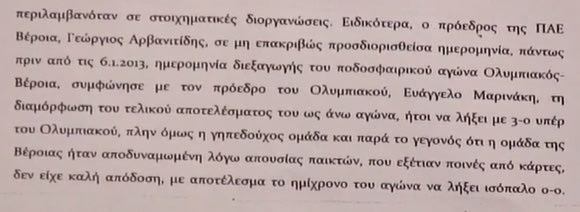 Συν τις άλλοις αναφέρεται: “O πρόεδρος της ΠΑΕ Βεροια Γεώργιος Αρβανιτίδης, σε μη επακριβώς προσδιορισθείσα ημερομηνία, πάντως πριν τις 6/1/2013, ημερομηνία διεξαγωγής του ποδοσφαιρικού αγώνα Ολυμπιακός-Βέροια, συμφώνησε με τον πρόεδρο του Ολυμπιακού Ευάγγελο Μαρινάκη τη διαμόρφωση του τελικού αποτελέσματος του ως άνω αγώνα, ήτοι να λήξει με 3-0 υπέρ του Ολυμπιακού, πλην όμως η γηπεδούχος ομάδα και παρά το γεγονός ότι η ομάδα της Βέροιας ήταν αποδυναμωμένη λόγω απουσίας παικτών που εξέτιαν ποινές από κάρτες, δεν είχε καλή απόδοση, με αποτέλεσμα το ημίχρονο του αγώνα να λήξει ισόπαλο 0-0″.