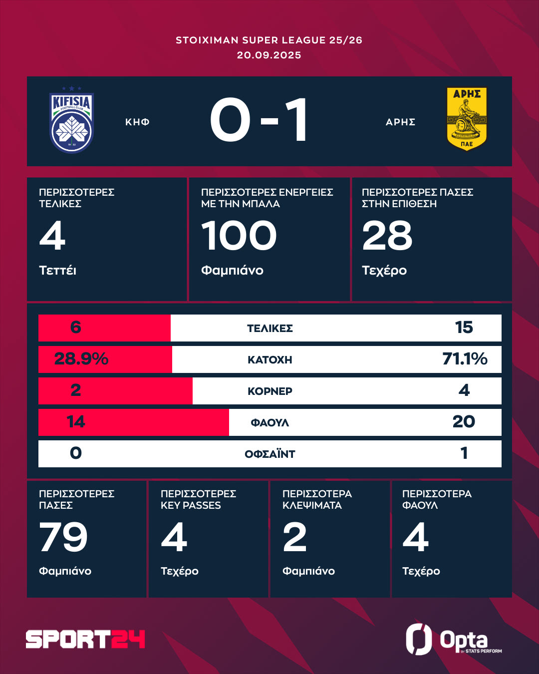 Την επόμενη αγωνιστική ο Άρης υποδέχεται τον Πανσερραϊκό στο “Κλ. Βικελίδης” (27/09, 20:30), ενώ η Κηφισιά φιλοξενείται από τον ΟΦΗ στην Κρήτη (28/09, 19:00).