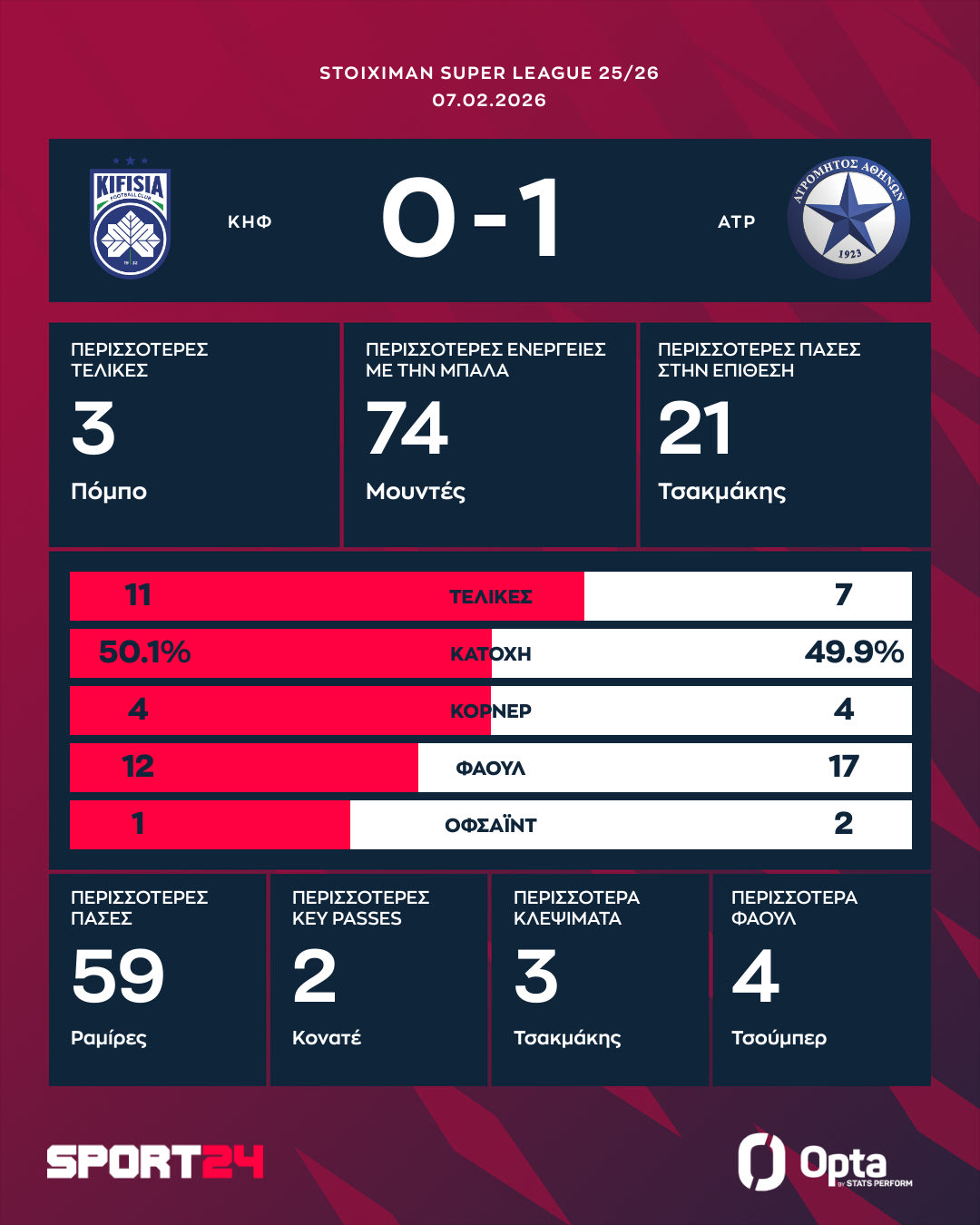 Στα εναπομείναντα λεπτά η Κηφισιά προσπάθησε να πάρει κάτι από το ματς, όμως είχε μόνο μία στιγμή με τον Νούνελι στο 78′, ενώ στο 86′ οι άνθρωποι και οι παίκτες της ομάδας από τα Βόρεια Προάστια διαμαρτυρήθηκαν για πέναλτι σε μαρκάρισμα του Μίχορλ στον Μποτία.
