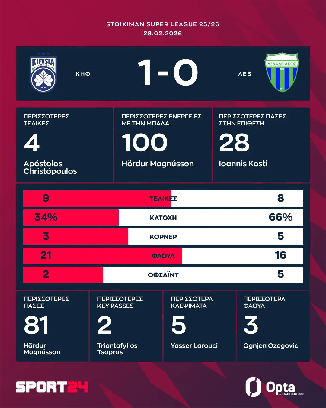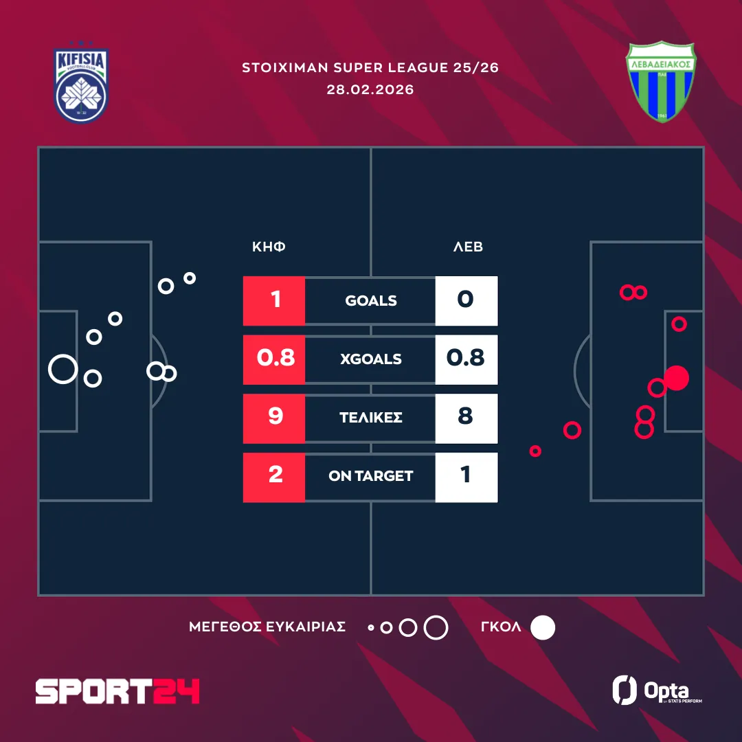 Η Κηφισιά πανηγύρισε σπουδαίο τρίποντο και μάλιστα την πρώτη της στο πρωτάθλημα για τo 2026. Η ομάδα των Βορείων Προαστίων επικράτησε 1-0 του Λεβαδειακού για την 23η αγωνιστική της Stoiximan Super League, με τους Βοιωτούς να αγνοούν τη νίκη από την 1η Φεβρουαρίου.