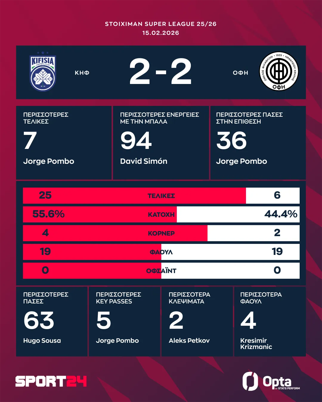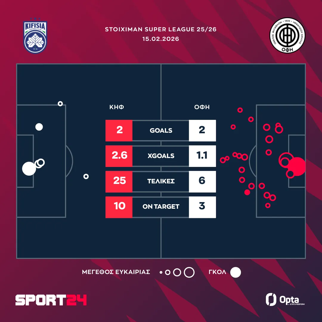 Στην βαθμολογία, ο ΟΦΗ είναι σταθερά στην 8η θέση με 25 πόντους, ενώ η Κηφισιά έφτασε τους 20 βαθμούς και βρίσκεται στην 11η θέση.