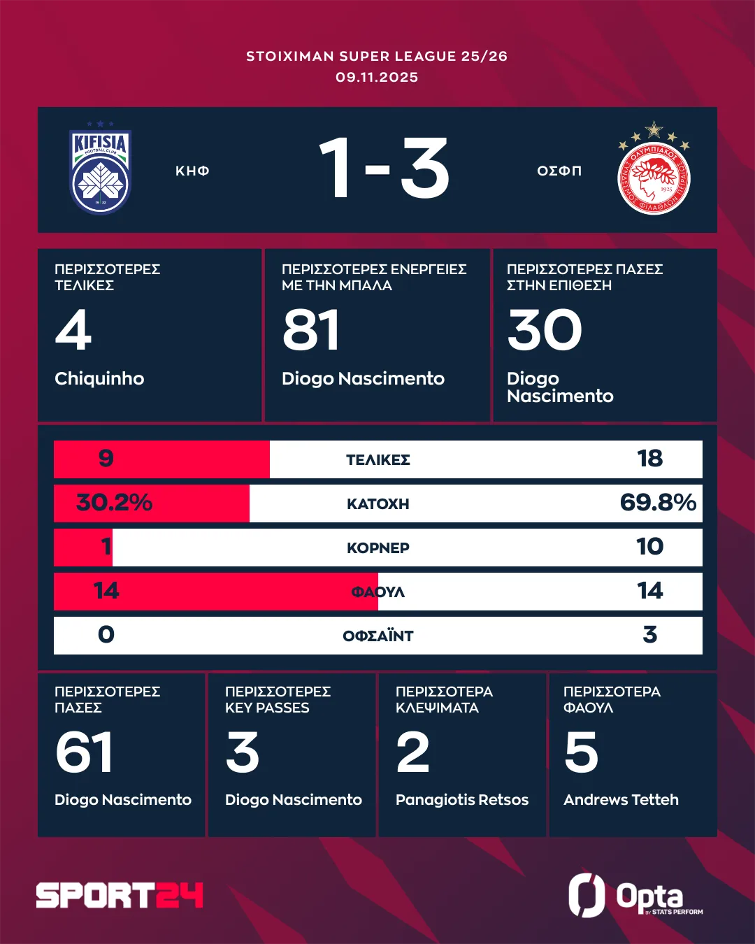 ΚΗΦΙΣΙΑ: Ραμίρες, Σιμόν (78′ Ντίας), Ποκόρνκι, Σόουζα (46′ Τζίμας), Λαρουσί (46′ Λαρουσί), Βιγιαφάνιες (46′ Βιγιαφάνιες), Εμπό, Πόμπο (78′ Χουχούμης), Ζέρσον, Παντελίδης, Τετέι