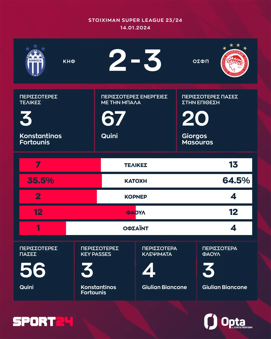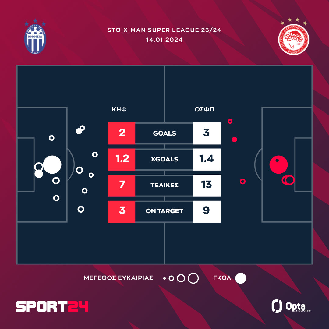 O Oλυμπιακός πήρε το διπλό στην Καισαριανή περνώντας δια πυρός και σιδήρου από την έδρα της Κηφισιάς. Οι ερυθρόλευκοι που αγωνίζονταν με δέκα παίκτες από το 45' επικράτησαν 3-2, με τον Αραμπί να πετυχαίνει το νικητήριο γκολ στο 85'.