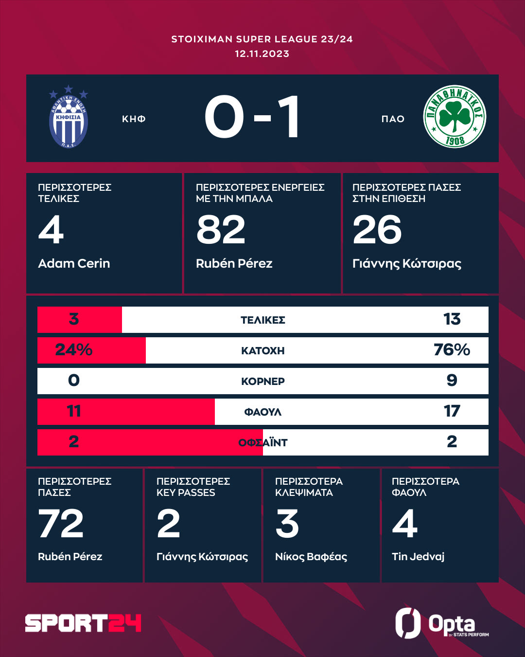 Τα στατιστικά και οι κορυφαίες επιδόσεις στο Κηφισιά - Παναθηναϊκός SPORT24/OPTA