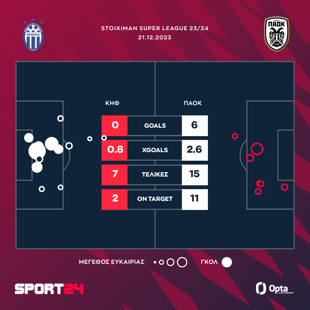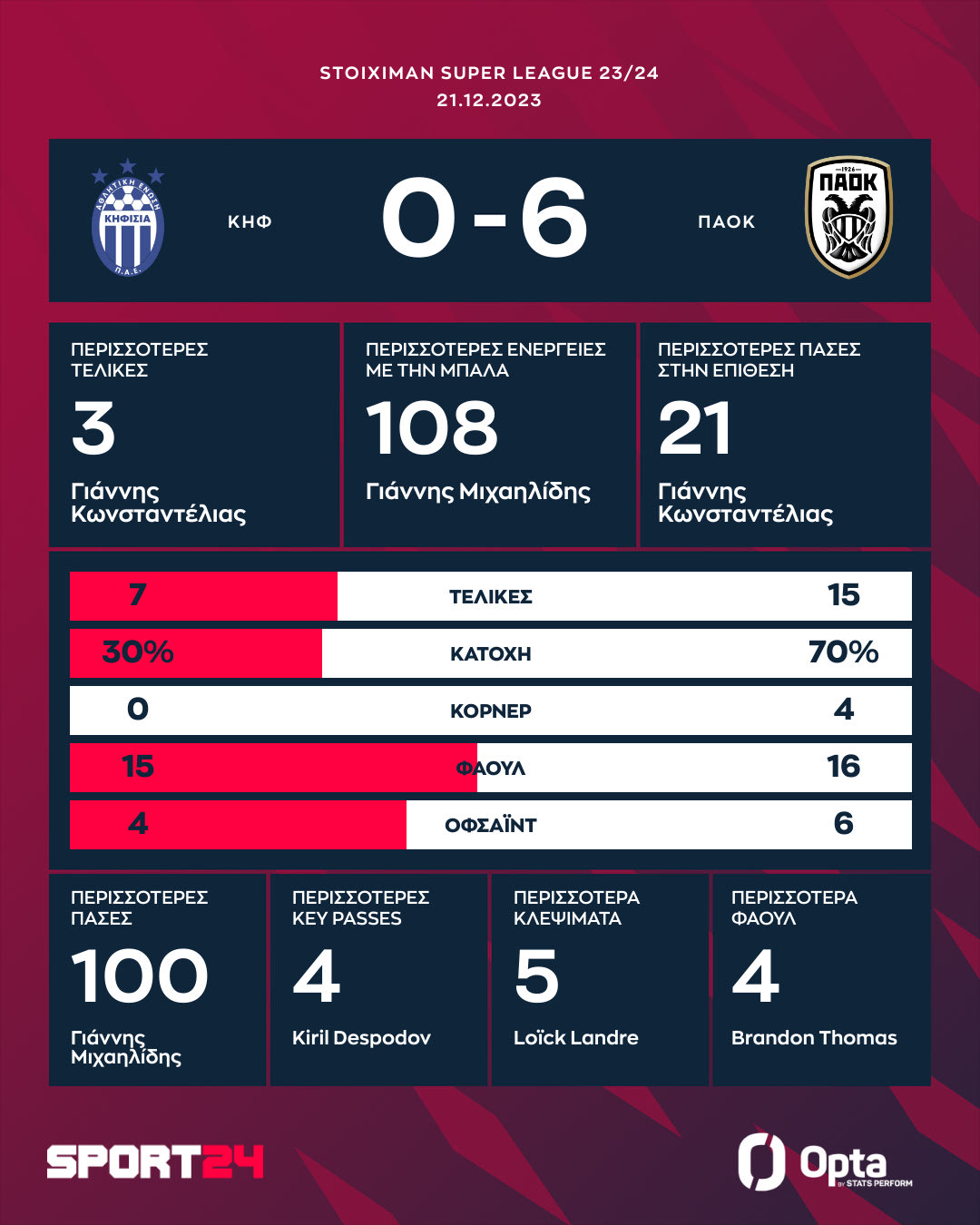 Οι φιλοξενούμενοι ήταν καλύτεροι από το πρώτο έως το τελευταίο λεπτό του αγώνα, δεν άφησαν περιθώρια αντίδρασης στον αντίπαλο τους που παρατάχθηκε να παίξει… ανοιχτά τον ΠΑΟΚ, έκανε φάσεις, αλλά ίσως αυτό ήταν το μεγαλύτερο λάθος της Κηφισιάς καθώς ο Δικέφαλος βρήκε χώρους και με τρία γκολ σε κάθε ημίχρονο έφτασε σε μια ευρεία επικράτηση.