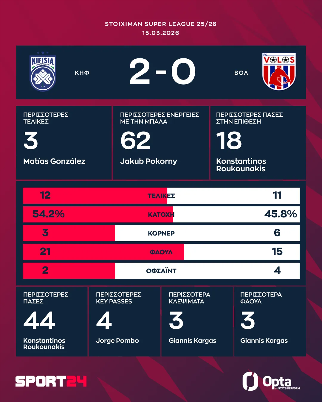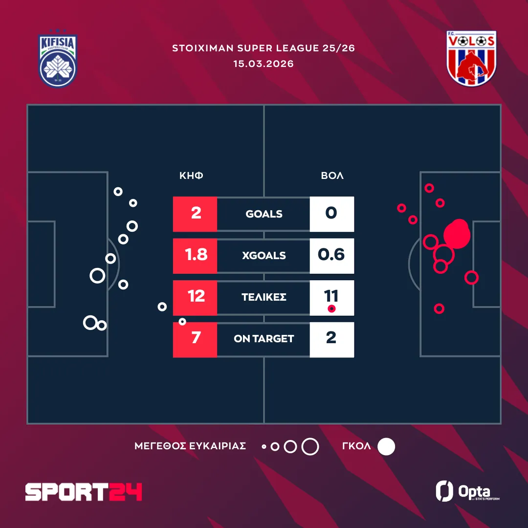 Η Κηφισιά επέβαλε τον ρυθμό της στο μεγαλύτερο μέρος της αναμέτρησης και επικράτησε δίκαια με 2-0 του Βόλου. Η ομάδα των Βορείων Προαστίων είχε τον έλεγχο του παιχνιδιού, δημιούργησε τις καλύτερες ευκαιρίες και έφτασε σε ένα σημαντικό τρίποντο στο πλαίσιο της 25ης αγωνιστικής της Stoiximan Super League.