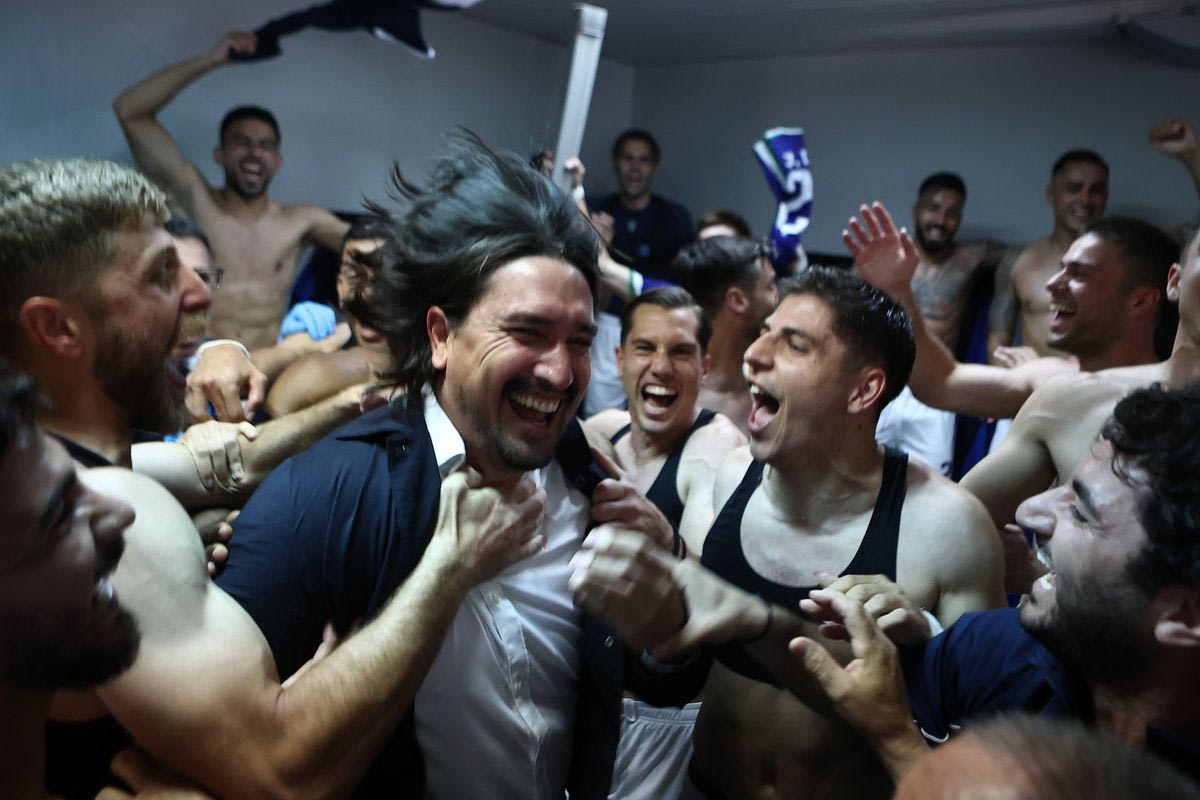 Οι παίκτες της Κηφισιάς και ο προπονητής τους, Σεμπαστιάν Λέτο, έγιναν ένα κουβάρι κατά τη διάρκεια των πανηγυρισμών τους στα αποδυτήρια μετά τον αγώνα με την Καλαμάτα.