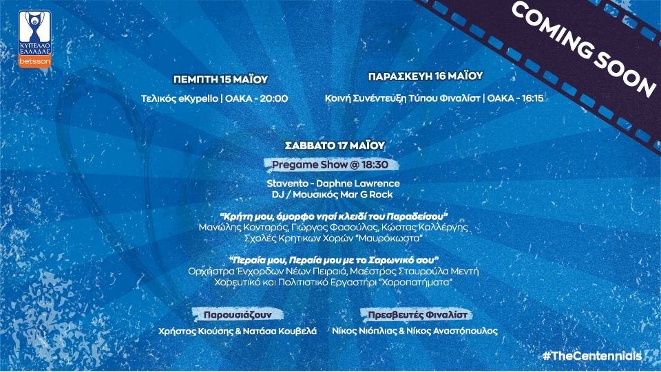 “Στον τελικό Κυπέλλου Ελλάδας Betsson 2025, τον 81ο στην ιστορία του θεσμού, ο οποίος θα διεξαχθεί το Σάββατο 17 Μαΐου και ώρα 20:00 στο ΟΑΚΑ, οι φιναλίστ γιορτάζουν 100 χρόνια από την ίδρυσή τους και διεκδικούν το τρόπαιο σε μια γιορτή που συνδέει το ποδόσφαιρο με τη μουσική και τον πολιτισμό. Το επίσημο hashtag της διοργάνωσης είναι το #TheCentennials, με το οποίο συνοψίζεται το επετειακό πνεύμα του τελικού.