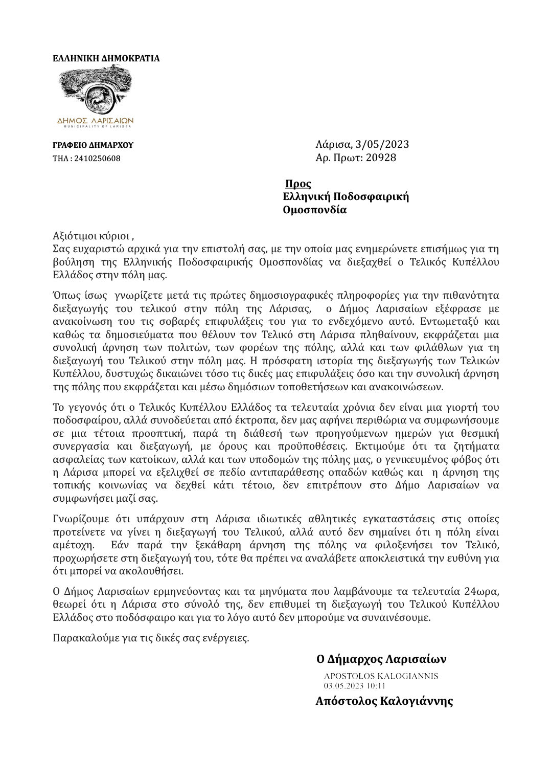 Το γεγονός ότι ο τελικός Κυπέλλου Ελλάδος τα τελευταία χρόνια δεν είναι μια γιορτή του ποδοσφαίρου, αλλά συνοδεύεται από έκτροπα, δεν μας αφήνει περιθώρια να συμφωνήσουμε σε μία τέτοια προοπτική, παρά τη διάθεση των προηγούμενων ημερών για θεσμική συνεργασία και διεξαγωγή, με όρους και προϋποθέσεις. Εκτιμούμε ότι τα ζητήματα ασφαλείας των κατοίκων, αλλά και των υποδομών της πόλης μας, ο γενικευμένος φόβος ότι η Λάρισα μπορεί να εξελιχθεί σε πεδίο αντιπαράθεσης οπαδών καθώς κι η άρνηση της τοπικής κοινωνίας να δεχθεί κάτι τέτοιο, δεν επιτρέπουν στον Δήμο Λαρισαίων να συμφωνήσει μαζί σας.