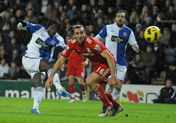 Blackburn Rovers' Zimbabwean striker Benjani Mwaruwari (L) scores Blackburn's second goal past Liverpool's Greek defender Sotirios Kyrgiakos (2nd L) during the English Premier League football match between Blackburn Rovers and Liverpool at Ewood Park in Blackburn, north-west England, on January 5, 2011. AFP PHOTO/ANDREW YATESFOR EDITORIAL USE ONLY Additional licence required for any commercial/promotional use or use on TV or internet (except identical online version of newspaper) of Premier League/Football League photos. Tel DataCo +44 207 2981656. Do not alter/modify photo. (Photo credit should read ANDREW YATES/AFP/Getty Images)