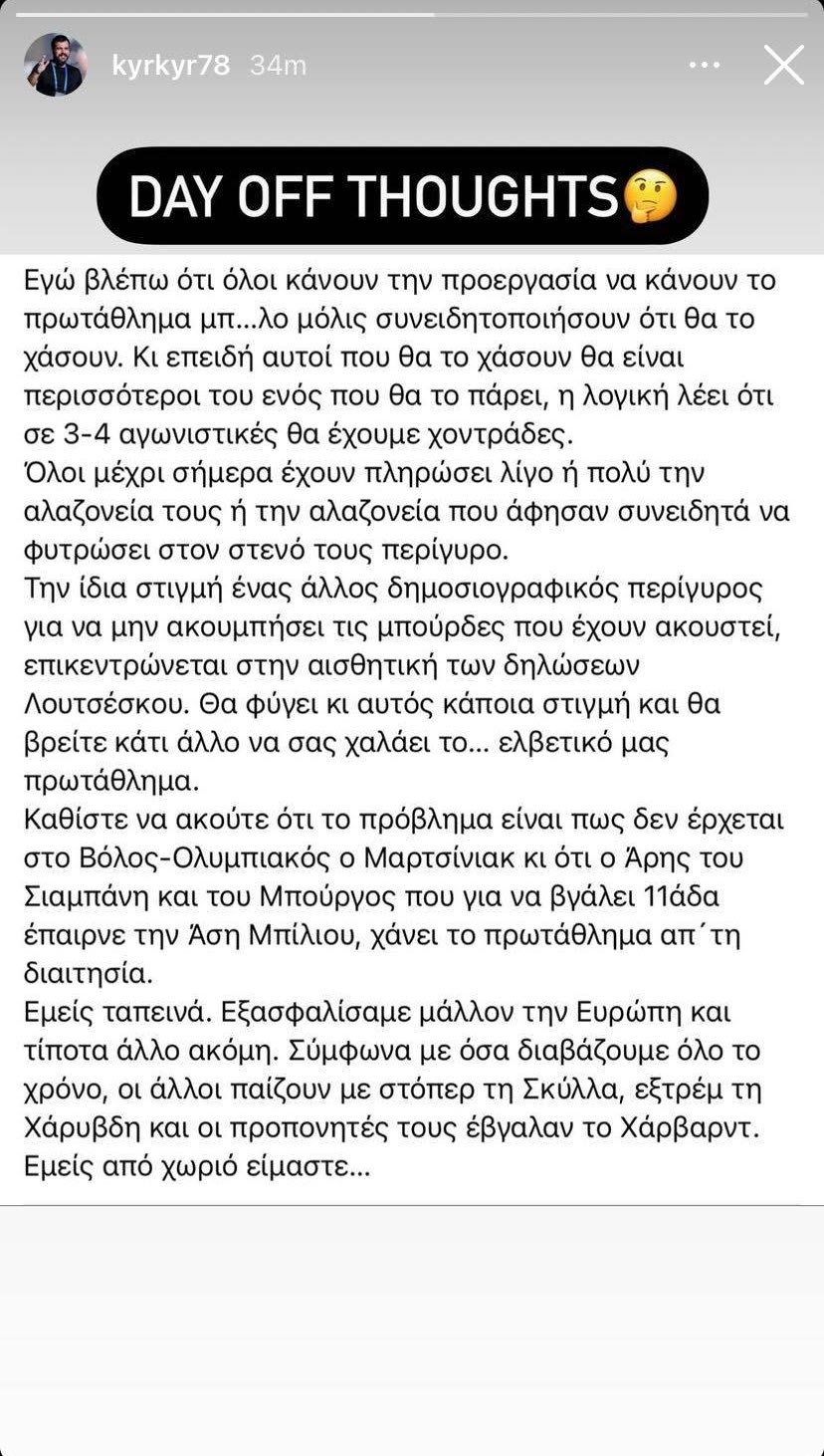 Ο υπεύθυνος επικοινωνίας του ΠΑΟΚ, Κυριάκος Κυριάκος, σε μία μακροσκελή ανάρτηση που δημοσίευσε στον λογαριασμό του στο Instagram σχολίασε όσα συμβαίνουν στο ελληνικό πρωτάθλημα και τα playoffs.