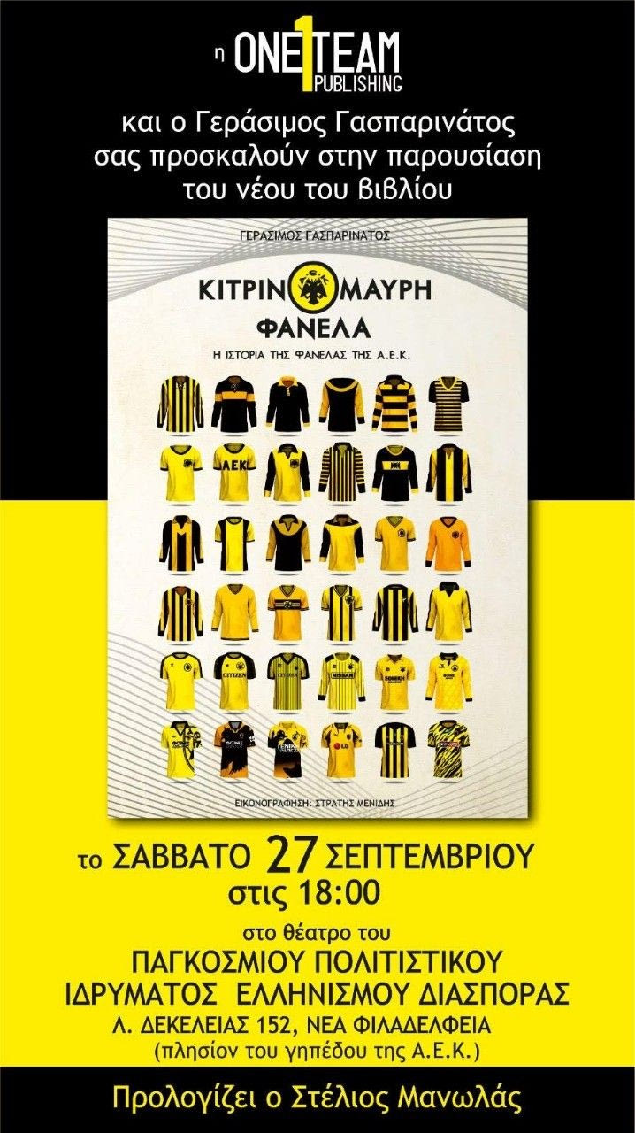 Το Σάββατο 28/9 στις 18:00, θα γίνει η παρουσίαση του βιβλίου “Κιτρινόμαυρη φανέλα – Η ιστορία της ΑΕΚ”, στο ανοικτό θέατρο του Παγκόσμιου Πολιτιστικού Ιδρύματος του Ελληνισμού της Διασποράς.