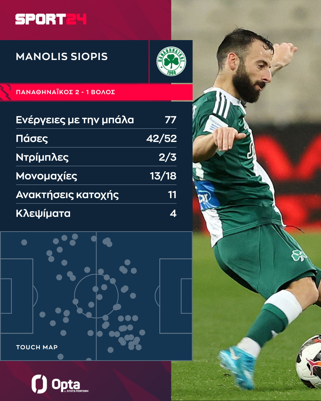 Ο Βιτόρια κράτησε τον Σιώπη σε όλο το ματς κι αυτός το ολοκλήρωσε με 77 ενέργειες με την μπάλα. Ο Έλληνας μέσος κινήθηκε παντού (εκτός από την περιοχή του Βόλου), όπως βλέπουμε στο γράφημα της Opta Stats / Perform με τις ενέργειές του.