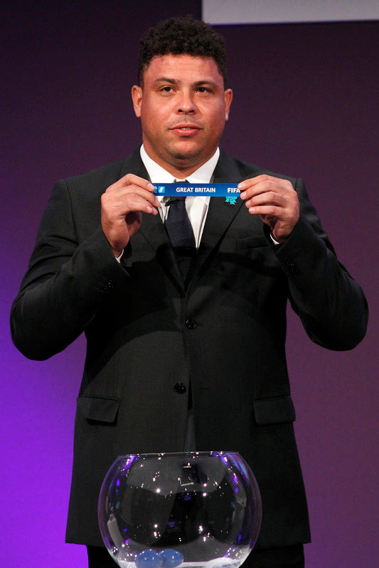 Former Brazilian footballer Ronaldo holds up Britain's paper during the draw for the London 2012 Olympic football tournament at Wembley Stadium in London, on April 24, 2012. Host nation Great Britain will kick off the Olympic football tournament against Senegal at Manchester United's Old Trafford ground on July 26 following the draw made at Wembley. AFP PHOTO / JUSTIN TALLIS (Photo credit should read JUSTIN TALLIS/AFP/Getty Images)