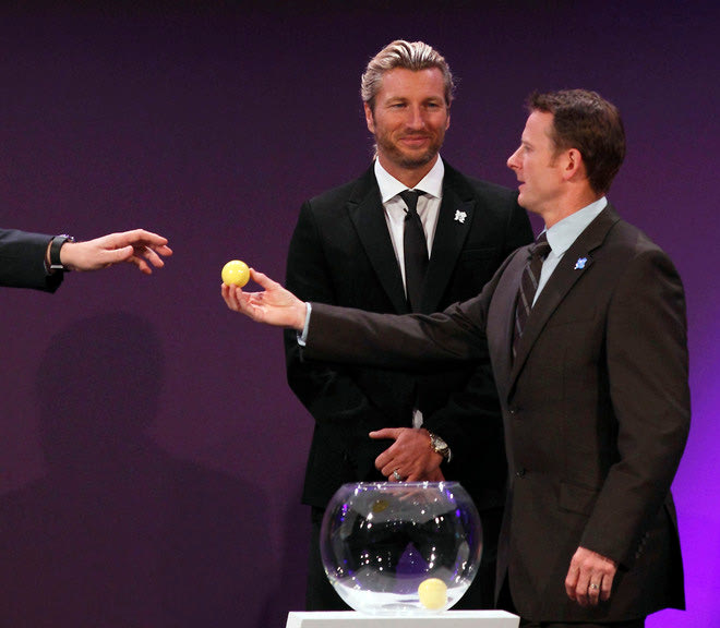 Former Welsh footballer Robbie Savage (C) smiles as former Scottish footballer Kevin Gallacher (R) passes his ball to be opened at the draw for the London 2012 Olympic football tournament at Wembley Stadium in London, on April 24, 2012. Host nation Great Britain will kick off the Olympic football tournament against Senegal at Manchester United's Old Trafford ground on July 26 following the draw made at Wembley. AFP PHOTO / JUSTIN TALLIS (Photo credit should read JUSTIN TALLIS/AFP/Getty Images)