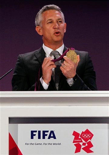 British former footballer Gary Lineker holds up an Olympic gold medal during the draw for the London 2012 Olympic soccer tournament, at Wembley Stadium in London, Tuesday, April 24, 2012. (AP Photo/Kirsty Wigglesworth)