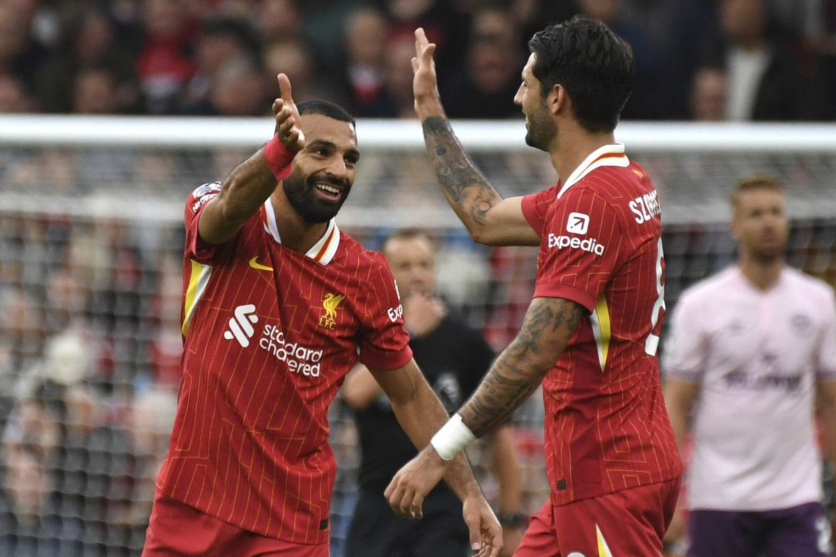 Liverpool's Mohamed Salah celebrates with Liverpool's Dominik Szoboszlai, right, after scoring his side's second goal during the English Premier League soccer match between Liverpool and Brentford at Anfield Stadium, Liverpool, England, Sunday, Aug. 25, 2024. (AP Photo/Rui Vieira)