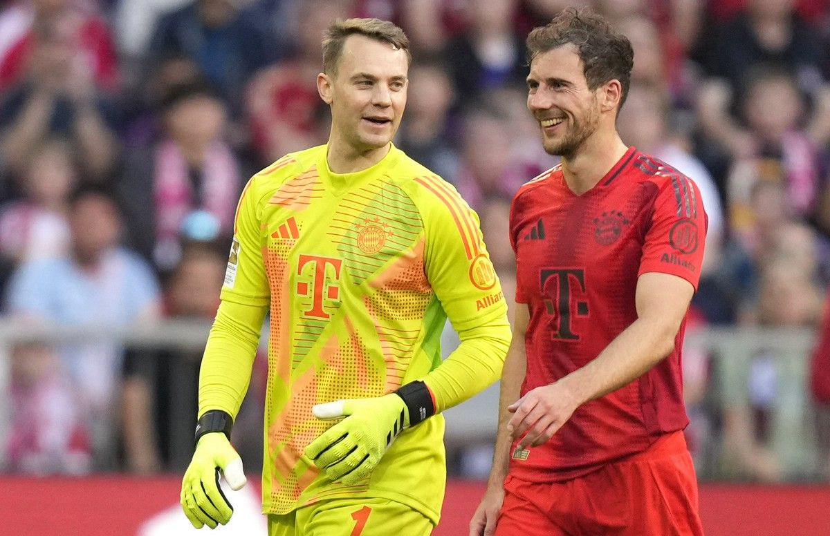 Bayern's goalkeeper Manuel Neuer, left, talks with Bayern's Leon Goretzka during the German Bundesliga soccer match between Bayern Munich and VfL Wolfsburg at the Allianz Arena in Munich, Germany, Sunday, May 12, 2024. (AP Photo/Matthias Schrader)