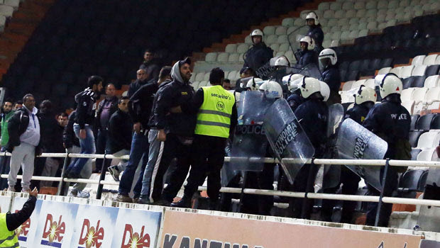 Αντί αυτών, από την έναρξη του αγώνα και μέχρι την είσοδο των διαιτητών στα αποδυτήρια, μετά τη λήξη του αγώνα φίλαθλοι της εγκαλουμένης κάθονταν στην πρώτη σειρά καθισμάτων και σχεδόν καθ όλη τη διάρκεια του αγώνα, κολλούσαν στα κάγκελα προκειμένου να βρίσουν τον διαιτητή, τον παρατηρητή, την SUPERLEAGUE και τον υπεύθυνο ασφαλείας αυτής.