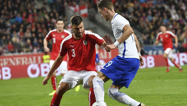 Austria's Aleksandar Dragovic, left, and Finland's Thomas Lam challenge for the ball during their international friendly soccer match at the Tivoli Stadium in Innsbruck, Austria, Tuesday, March 28, 2017. (AP Photo/Kerstin Joensson)