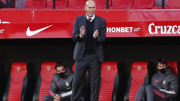 O Ζινεντίν Ζιντάν χειροκροτεί τους παίκτες της Ρεάλ κατά τη διάρκεια του αγώνα στην La Liga με την Σεβίλλη