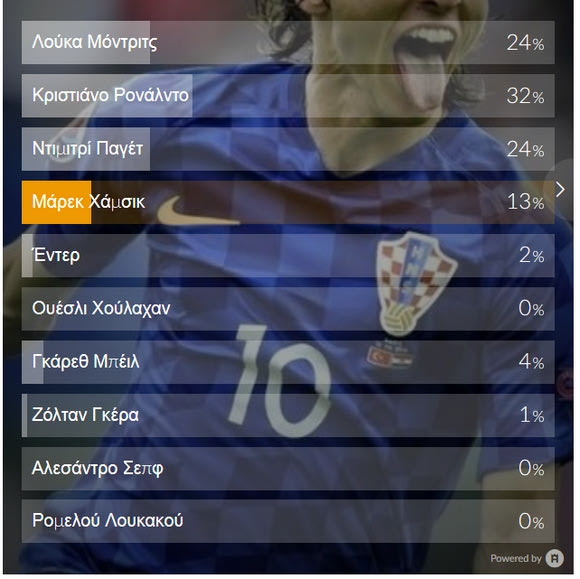 Από ‘κει και πέρα, ισοβάθμησαν στο 24% οι Μόντριτς και Παγέτ για τα γκολ τους με Τουρκία και Ρουμανία, ενώ ακολούθησε αυτό του Χάμσικ στο 2-1 της Σλοβακίας με τη Ρωσία. Ο Μπέιλ πήρε 4% για το φάουλ με την Αγγλία, 2% ο Έντερ για το γκολ με την Σουηδία και 1% ο Γκέρα για το δεύτερο τέρμα της Ουγγαρίας με την Αυστρία με σκαφτό πλασέ.