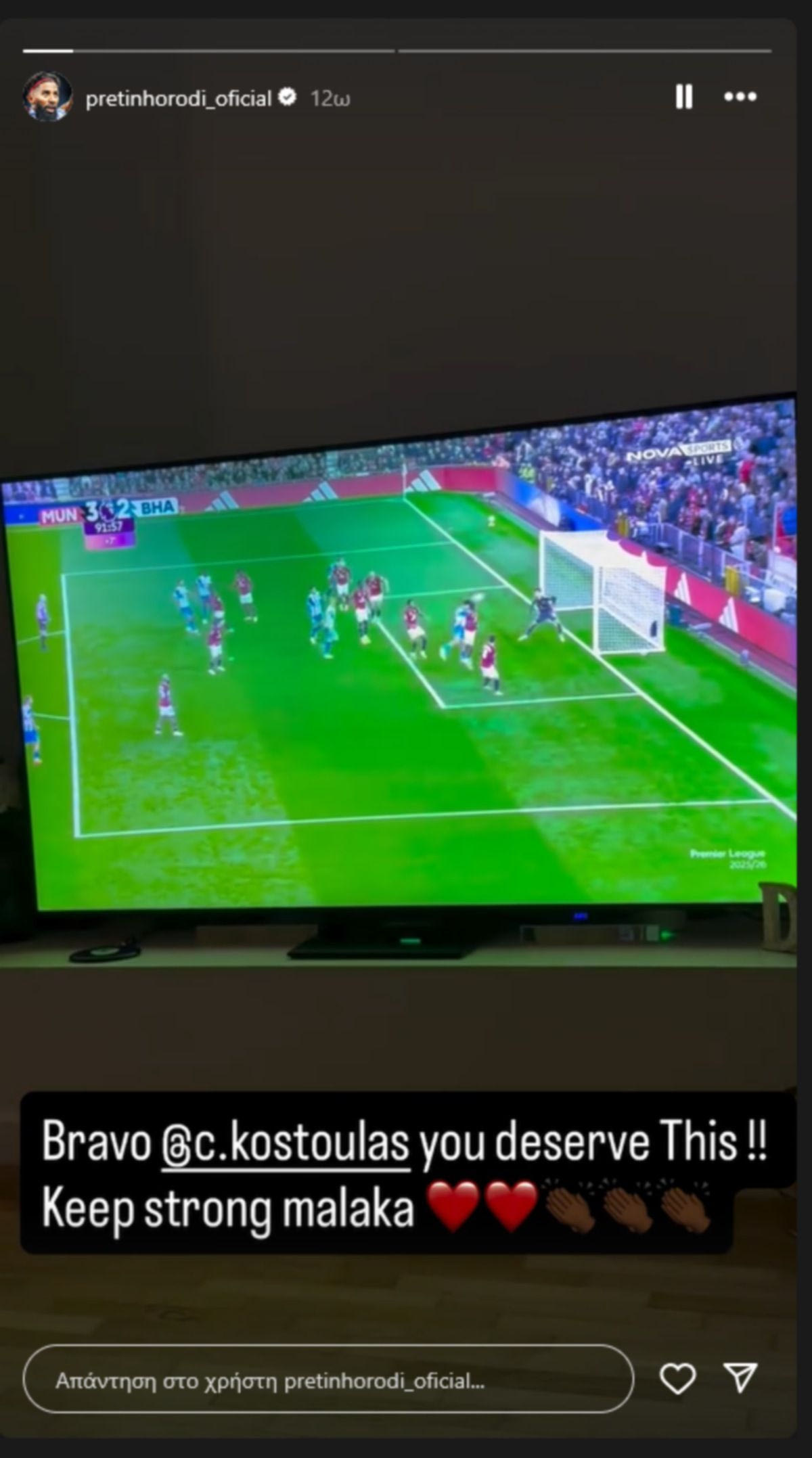 Πέρα από τα εύσημα που απέσπασε από τους συμπαίκτες του για το παρθενικό του τέρμα στον μαγικό κόσμο της Premier League, ο Κωστούλας έγινε αντικείμενο θαυμασμού και από τους πρώην συνοδοιπόρους του στον Ολυμπιακό, με τους Αγιούμπ Ελ Κααμπί και Ροντινέι να σπεύδουν να τον αποθεώσουν μέσω Instastory.