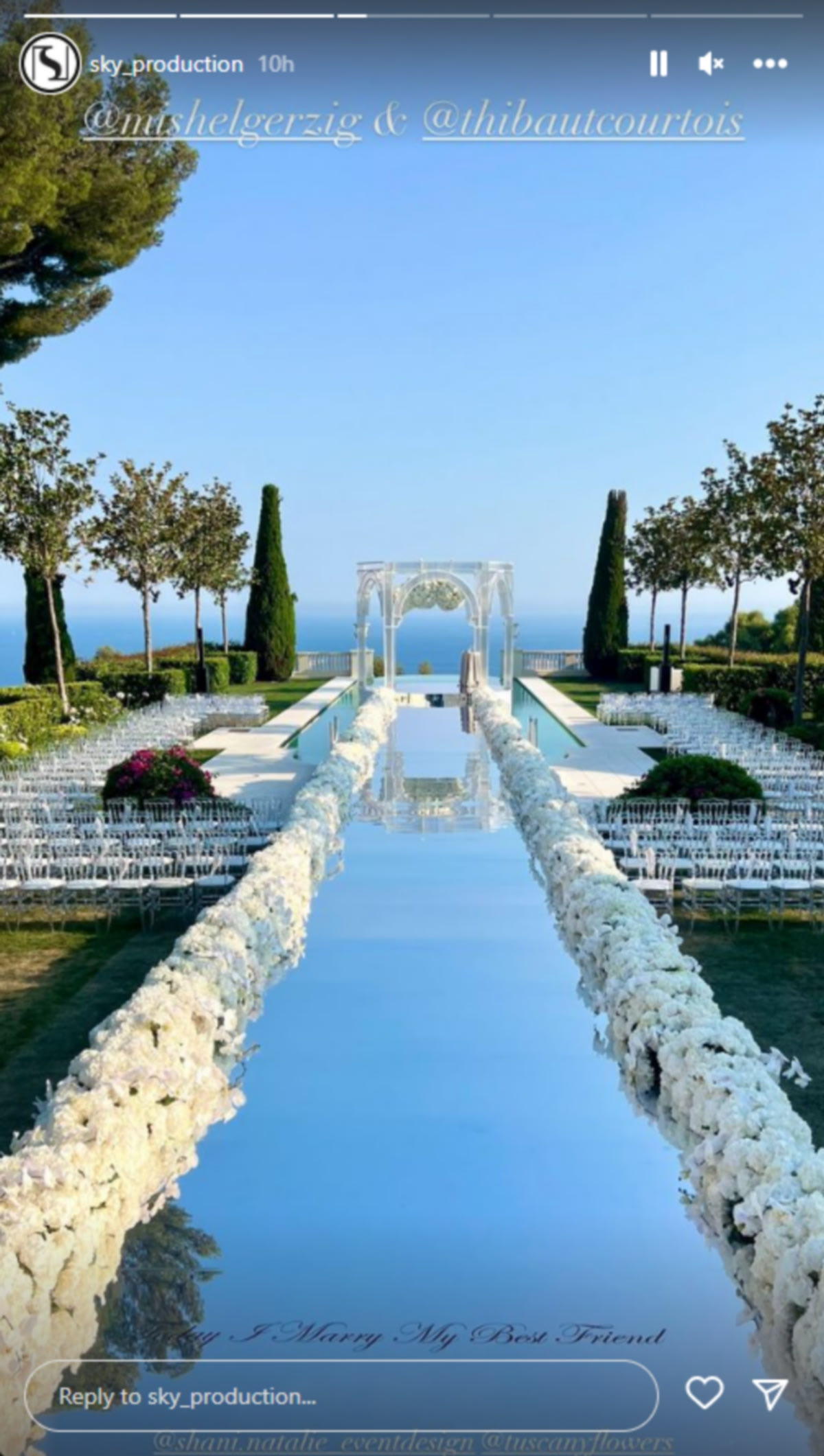 Η γαμήλια τελετή πραγματοποιήθηκε σε ένα πανέμορφο κτήμα στις Κάννες. Αμέσως μετά το μυστήριο, το νεόνυμφο ζευγάρι διασκέδασε ξέφρενα, χορεύοντας και τραγουδώντας στο πάρτι που είχαν διοργανώσει με τους αγαπημένους τους ανθρώπους.