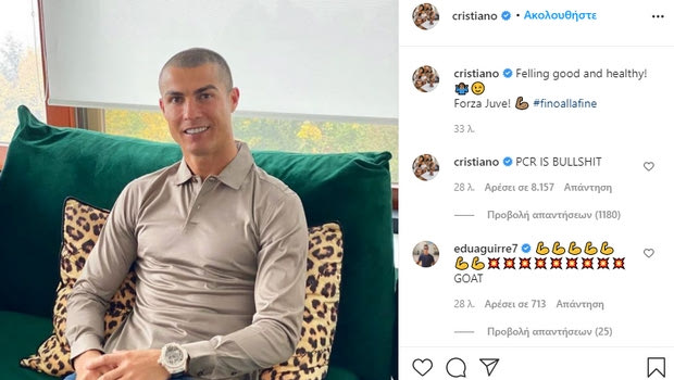 Ο CR7 ανέβασε μία φωτογραφία στο Instagram και σχολίασε πως “αισθάνομαι καλά και υγιής”, ενώ στη συνέχεια συμπλήρωσε πως “το τεστ κορονοϊού είναι μία μ@@@@@α”.