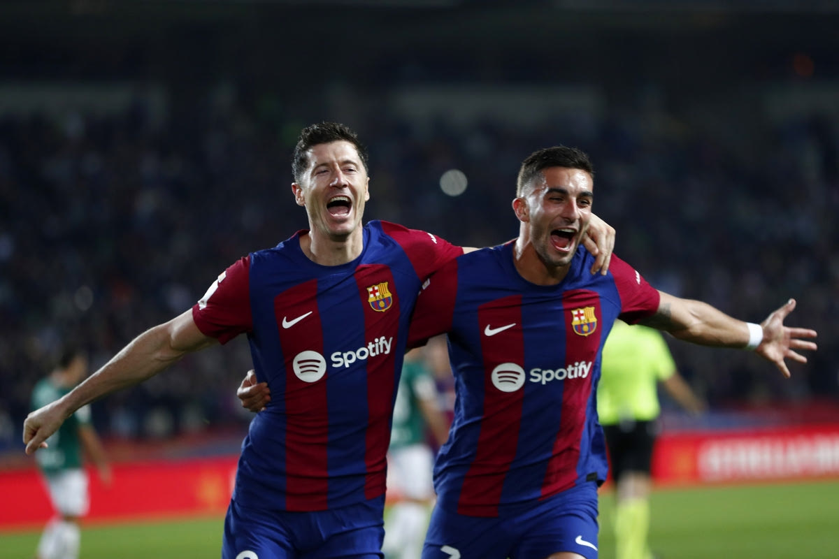 Ρόμπερτ Λεβαντόφσκι και Φεράν Τόρες πανηγυρίζουν το δεύτερο γκολ της Μπαρτσελόνα στον αγώνα για τη La Liga εναντίον της Αλαβές 2023 AP Images/Joan Monfort