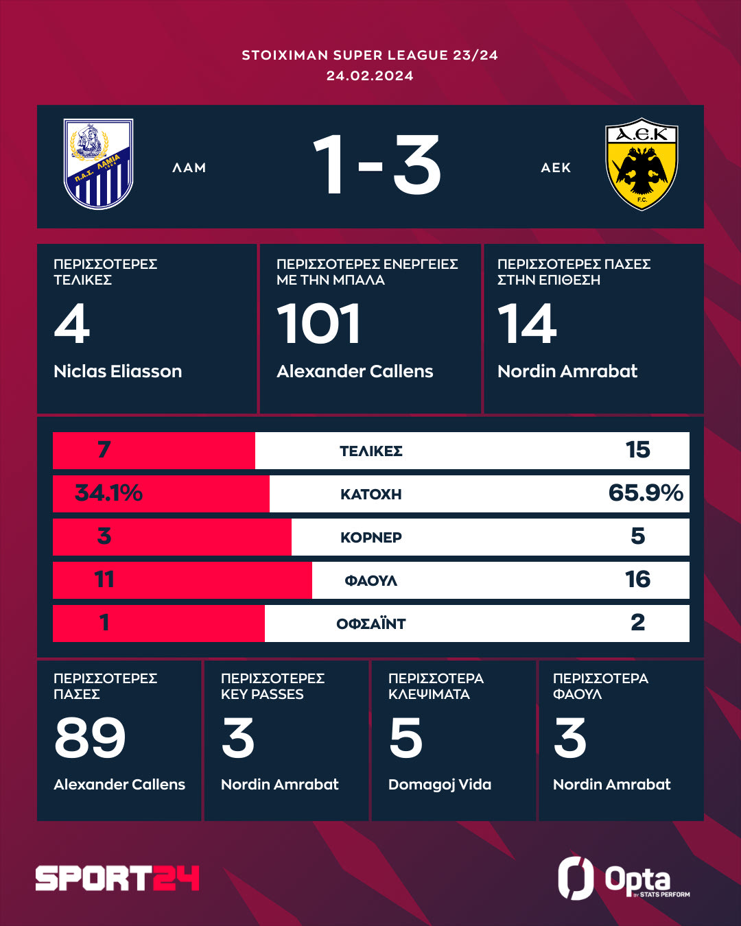 Η ΑΕΚ με αυτό το τρίποντο έφτασε τους 55 και θα περιμένει τα αποτελέσματα από τους διώκτες της. Η Λαμία έμεινε στους 34 και την έκτη θέση και θα συνεχίσει τη μάχη για την είσοδο στα playoffs.