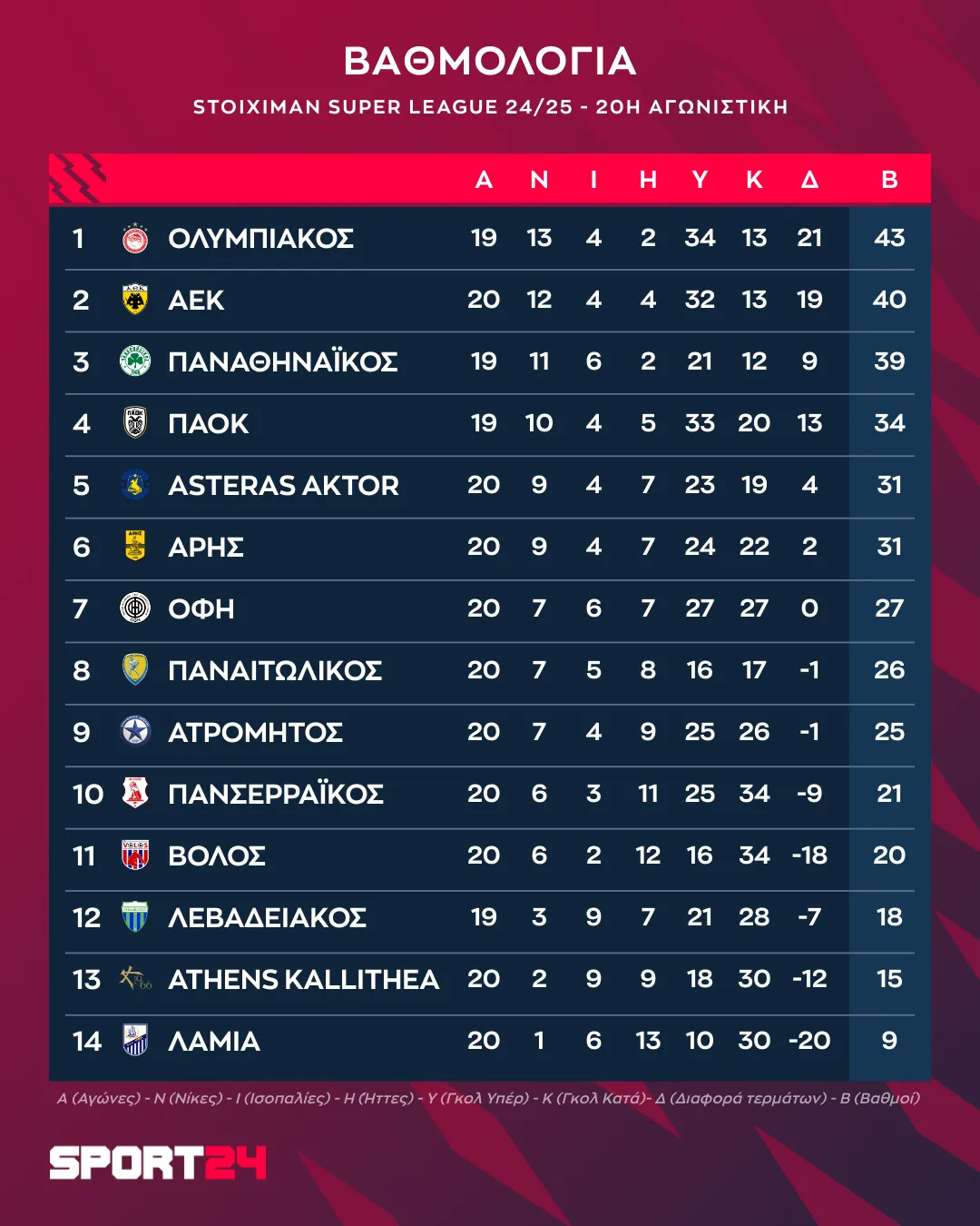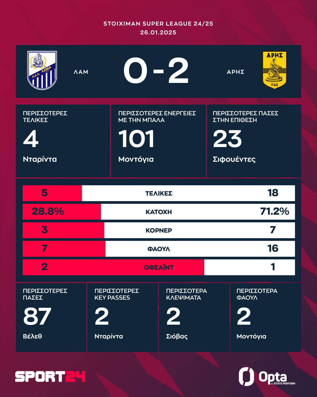 Με αυτό το αποτέλεσμα ο Άρης έφτασε τους 31 βαθμούς, έπιασε τον Αστέρα Τρίπολης AKTOR και μείωσε στους τρεις τη διαφορά τους από τον τέταρτο ΠΑΟΚ.