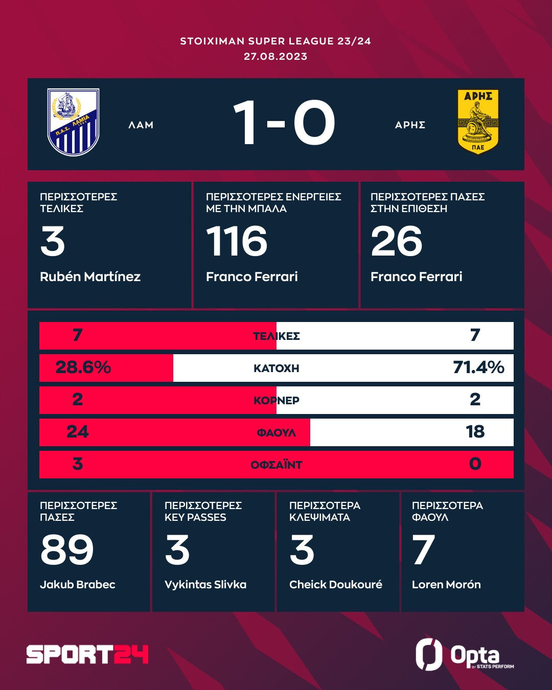 Οι καλύτερες επιδόσεις και τα κορυφαία στατιστικά στην αναμέτρηση της Λαμίας με τον Άρη OPTA/SPORT24