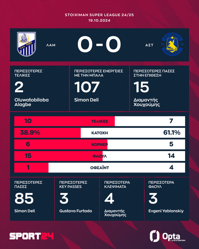 Η Λαμία και ο Αστέρας Τρίπολης AKTOR αναδείχθηκαν ισόπαλοι χωρίς σκορ (0-0) στο “Αθανάσιος Διάκος” για την 8η αγωνιστική της Stoiximan Super League.