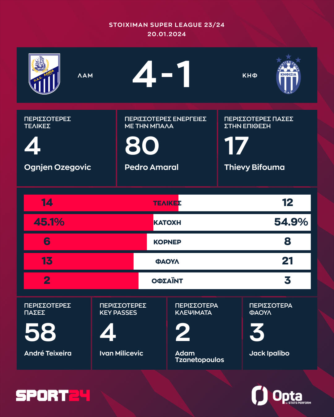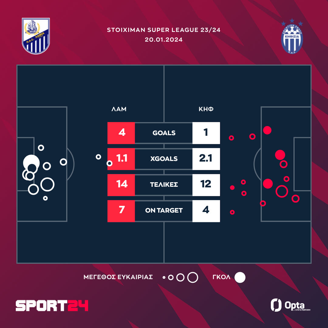 Ο Λαντρ άνοιξε το σκορ στο 12′ για την Κηφισιά, η οποία είχε καλές στιγμές στο παιχνίδι (2,1xG) . Όμως οι Σιμόν (23′), Μαρτίνεθ (39′) έφεραν το ματς “τούμπα” και οι Καρλίτος (56′) και Μάλτσι (87′) “κλείδωσαν” το τρίποντο για την ομάδα της Φθιώτιδας, με θριαμβευτικό τρόπο.