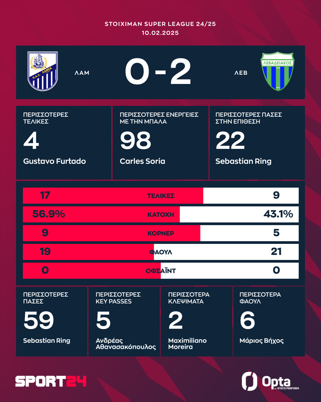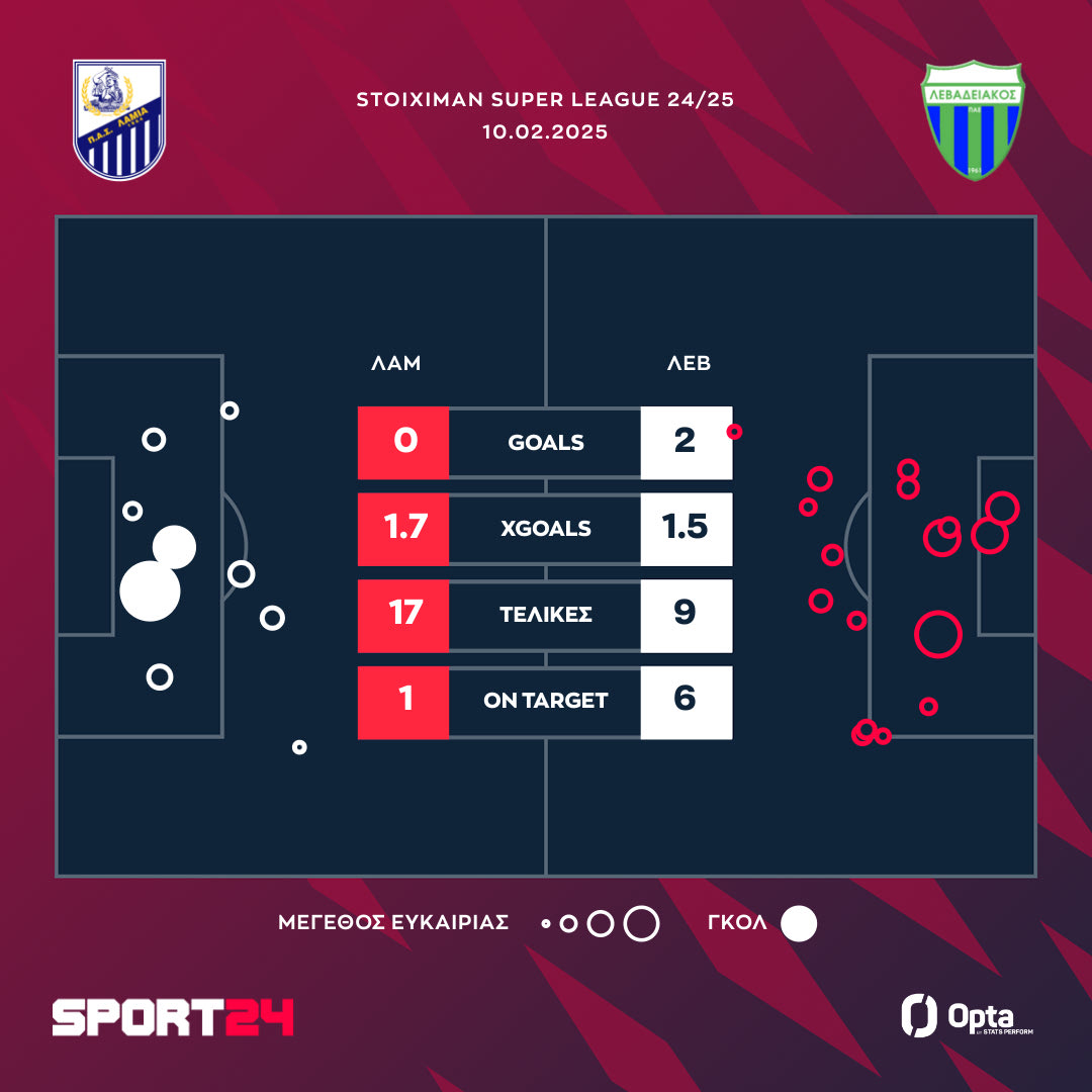 Ο Λεβαδειακός εξαργύρωσε ουσιαστικά το εξαιρετικό πρώτο μέρος του, όπου σκόραρε δις στο πρώτο 20λεπτο με Κωστή και Ζίνι και είχε και άλλες ευκαιρίες στη συνέχεια, με την Λαμία από την πλευρά της να υπερτερεί στο δεύτερο και να έχει κλασικές ευκαιρίες αλλά να αδυνατεί να τις μετουσιώσει σε γκολ (17-9 οι τελικές και 1.7-1.5 τα xgoals), για να φύγει μοιραία με άδεια χέρια από το γήπεδο.