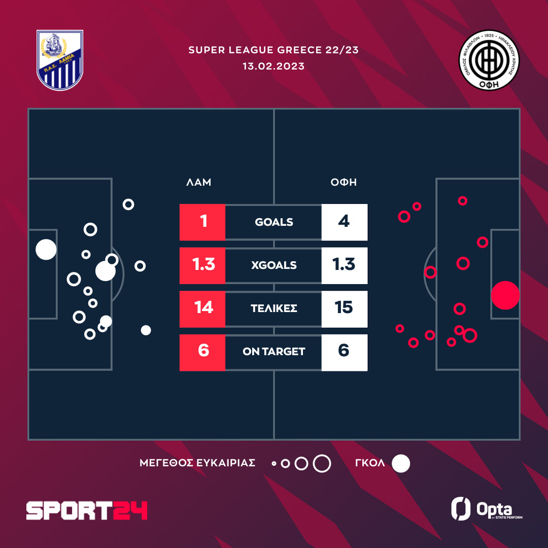 Κάπως έτσι ο ΟΦΗ έφτασε τους 23 πόντους και απέχει οκτώ πόντους από την έκτη θέση. Από την άλλη, η Λαμία παρέμεινε στην τελευταία θέση με 12 βαθμούς.