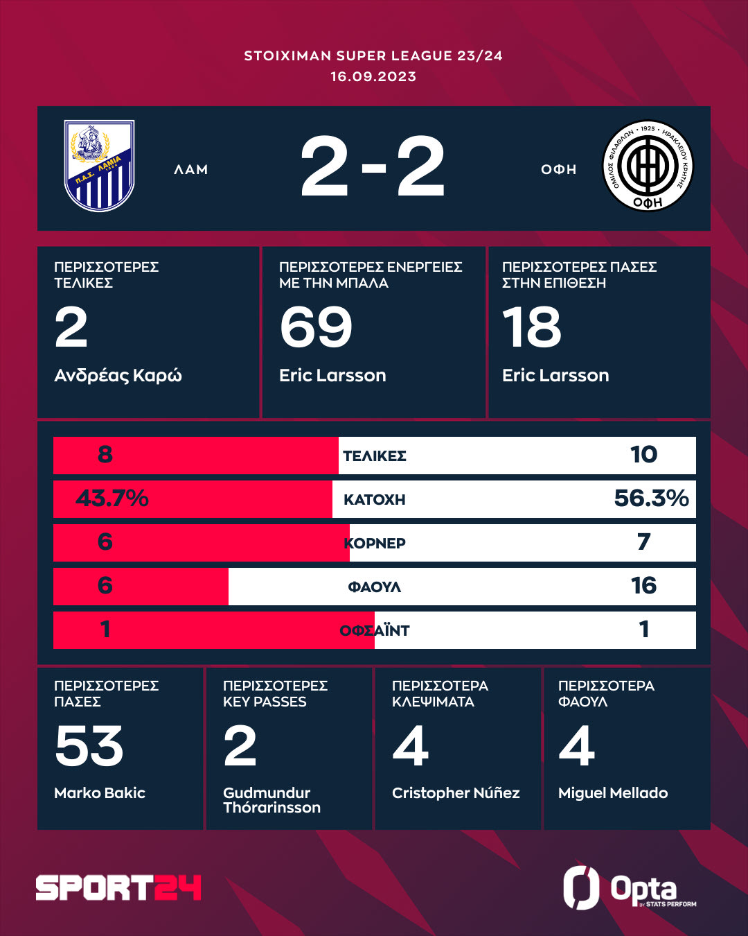 Όσον αφορά στη βαθμολογία της Stoiximan Super League, ο ΟΦΗ έφτασε τους επτά πόντους, ενώ η Λαμία, η οποία επέστρεψε στις νίκες έχει συγκεντρώσει πέντε βαθμούς.