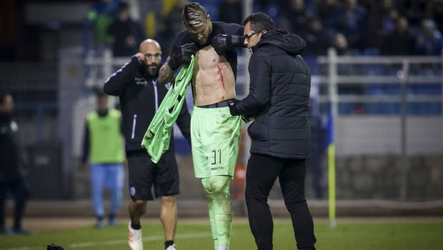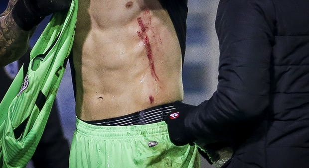 Ο Μπαράλες προσπάθησε να πιάσει κεφαλιά για να σκοράρει, αλλά αντ' αυτού χτύπησε τον Πασχαλάκη στα πλευρά με σκαριά, προκαλώντας του πληγή. Φωτογραφίες και videos από τον τραυματισμό. (PHOTOS, VIDEO)