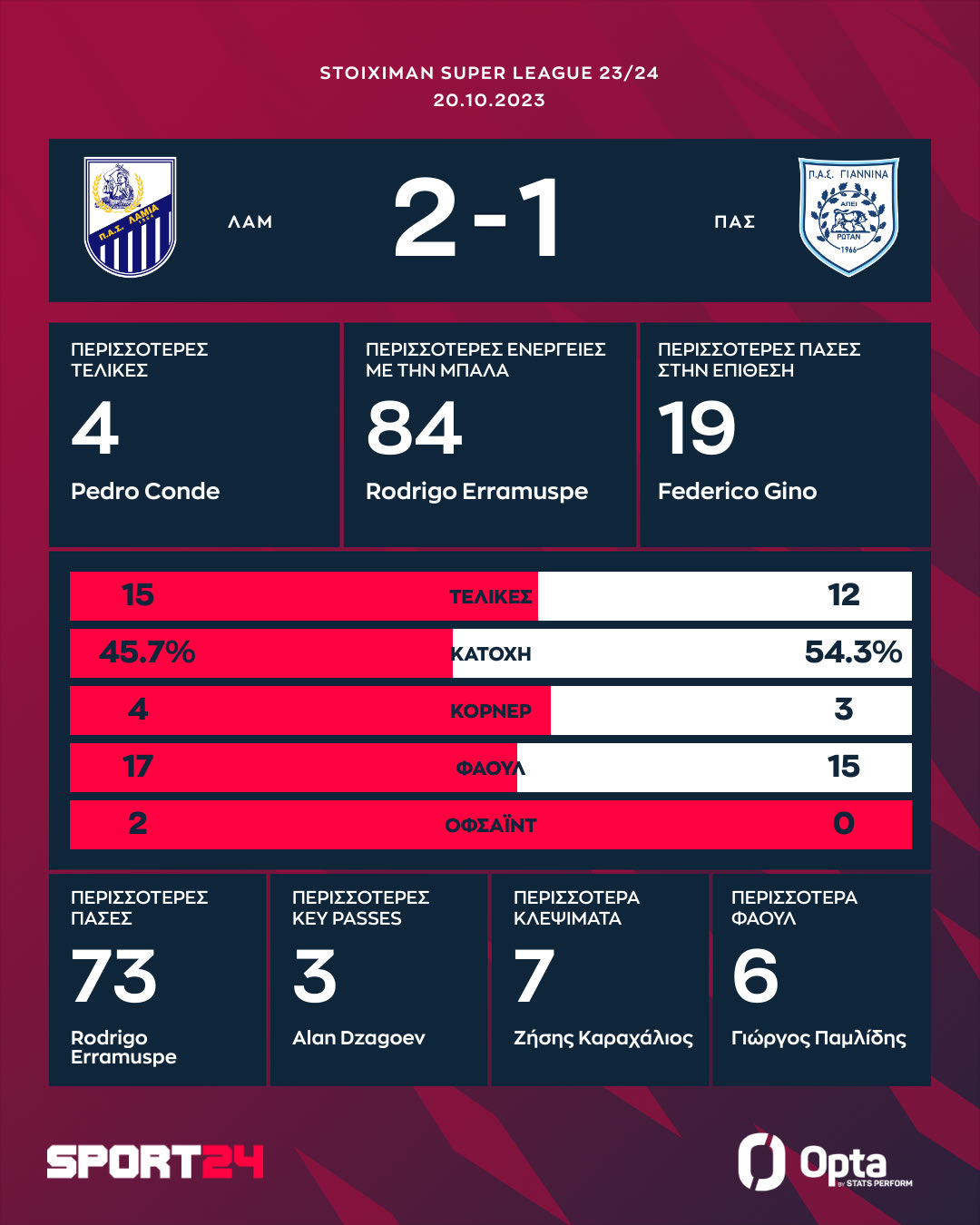 Μετά από εκτέλεση κόρνερ και την απομάκρυνση του Εραμούσπε, ο Μαρτίνεθ έκανε ένα δυνατό σκαστό σουτ έξω από την περιοχή, με την μπάλα να κοντράρει αρχικά στον Τζίμα και στη συνέχεια να καταλήγει στην εστία του Κλέιμαν για το 1-0 της Λαμίας.