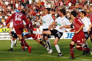 | 0-2 για τον ΠΑΟΚ! Εκτέλεση φάουλ από τον Λάκη, με τον Μπαλάφα να εκμεταλλεύται την αδράνεια της άμυνας των γηπεδούχων και με κεφαλιά να νικάει για δεύτερη φορά τον Κηπουρό. | ||