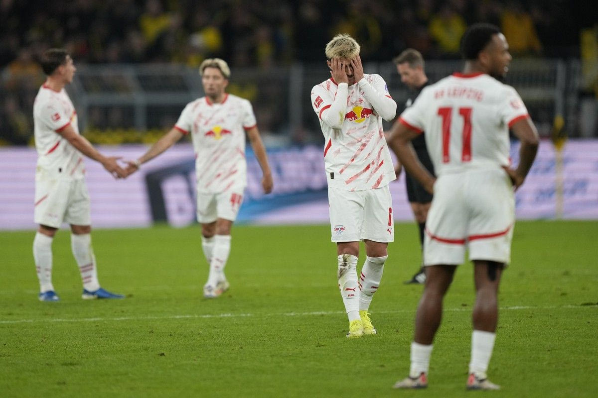 Leipzig players stand dejected after the German Bundesliga soccer match between Borussia Dortmund and RB Leipzig at the Signal-Iduna Park in Dortmund, Germany, Saturday, Nov. 2, 2024. (AP Photo/Martin Meissner)