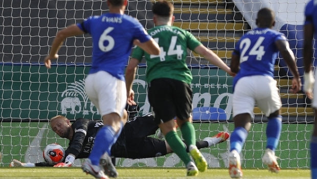 Leicester's goalkeeper Kasper Schmeichel saves a penalty during the English Premier League soccer match between Leicester City and Brighton & Hove Albion at the King Power Stadium, in Leicester, England, Tuesday, June 23, 2020. (Darren Staples/Pool via AP)